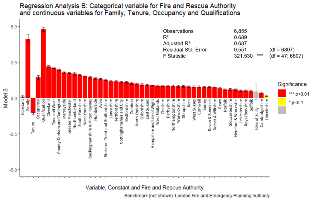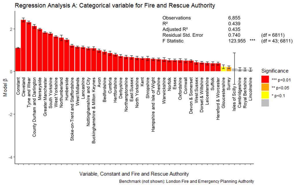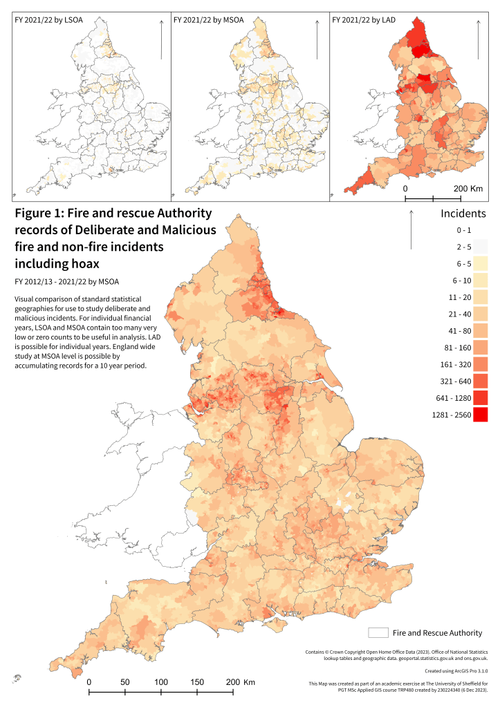 The model outputs were used to show that there were statistically significant distributions of deliberate and malicious fire and non-fire incidents including hoax calls by Fire and Rescue Authority. Two models were presented that looked exclusively at Fire and Rescue Authority boundaries and one that also considered the selected continuous variables.