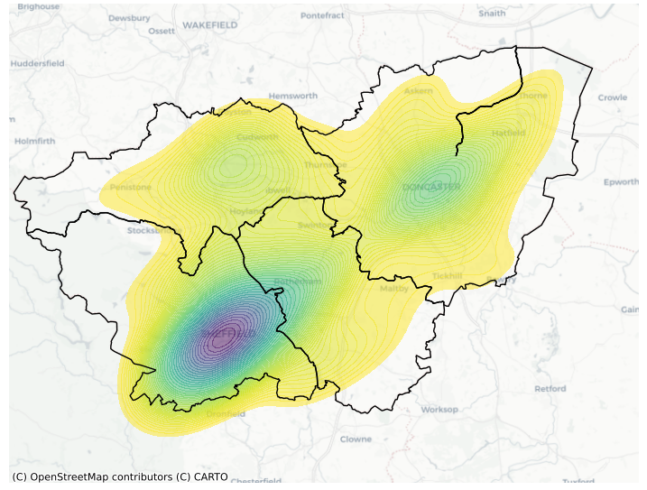The database was wrangled, measured and filtered to extract cyclists killed and seriously injured in South Yorkshire Police Force Area. This kernel density plot shows the high density of serious and fatal accidents in Sheffield.